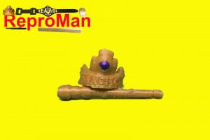 The crown and scepter have approximately the same dimensions as the original WWF Hasbro accessories from series 2 from 1991. They fit well on the head or hand of the Macho King. They are made of gold solid plastic. Each custom product I offer here is unique. The photos show only one crown and one scepter each, on others the appearance may vary a bit but the difference is hardly noticeable. The figurines or other items seen in the photo are not part of the sale.